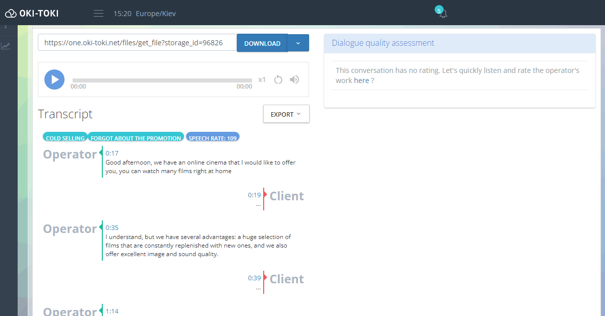 Oki-Toki también ofrece la posibilidad de exportar la transcripción a un archivo html y almacenarla en Google Drive o en el ordenador de trabajo. Esto proporcionará un acceso conveniente a los diálogos de los agentes, y también permitirá compartirlos con otros miembros del equipo o expertos externos para realizar un análisis adicional.