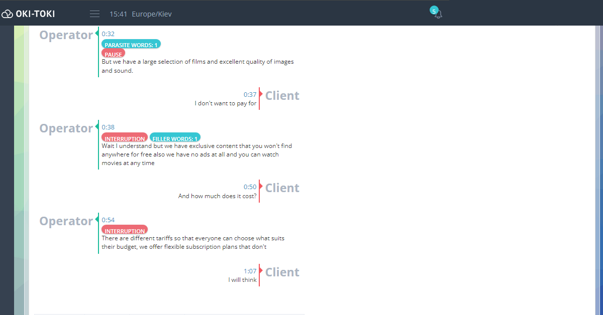 La transcripción no es solo una herramienta valiosa para convertir la conversación en texto, sino también para su uso en la analítica de voz. La analítica de voz (Speech Analytics) en Oki-Toki automáticamente agrega etiquetas a las transcripciones, que llaman la atención de los supervisores o del departamento de control de calidad, lo que simplifica significativamente el proceso de análisis de conversaciones por cada agente.