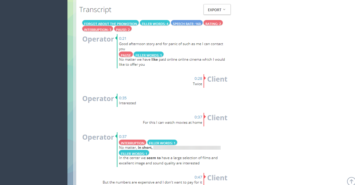 Es decir, la herramienta de analítica de voz introduce etiquetas en la transcripción, que ayudan a los supervisores o al call center a prestar atención a las interrupciones del agente al cliente, las pausas o el uso de lenguaje inapropiado. Gracias al uso de la transcripción y la analítica de voz, se pueden identificar las fortalezas y debilidades en el servicio al cliente, mejorar la eficiencia del trabajo del centro de llamadas, así como mejorar la calidad del servicio. Más información sobre la analítica de voz en el centro de llamadas hay un artículo separado en el blog.