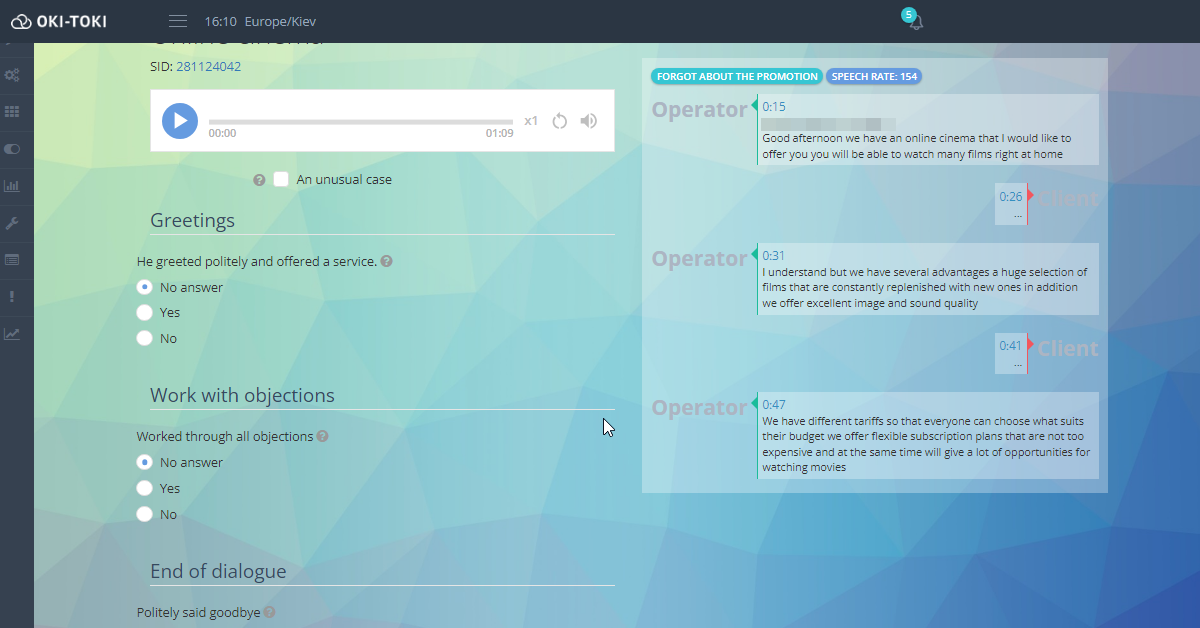 La evaluación de diálogos es una de las funciones clave del servicio Oki-Toki para control de calidad. Con la ayuda de las hojas de evaluación, se puede evaluar la llamada según criterios relacionados con la calidad del diálogo del agente con el cliente. Por ejemplo, la claridad de las declaraciones del agente, cortesía en la comunicación, y también la capacidad de resolver los problemas del cliente de manera efectiva y profesional.