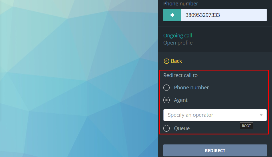 - Añadimos la posibilidad de transferir al abonado a un número de teléfono externo, a un usuario o a una cola, presentándolo en una lista desplegable con capacidad de búsqueda.