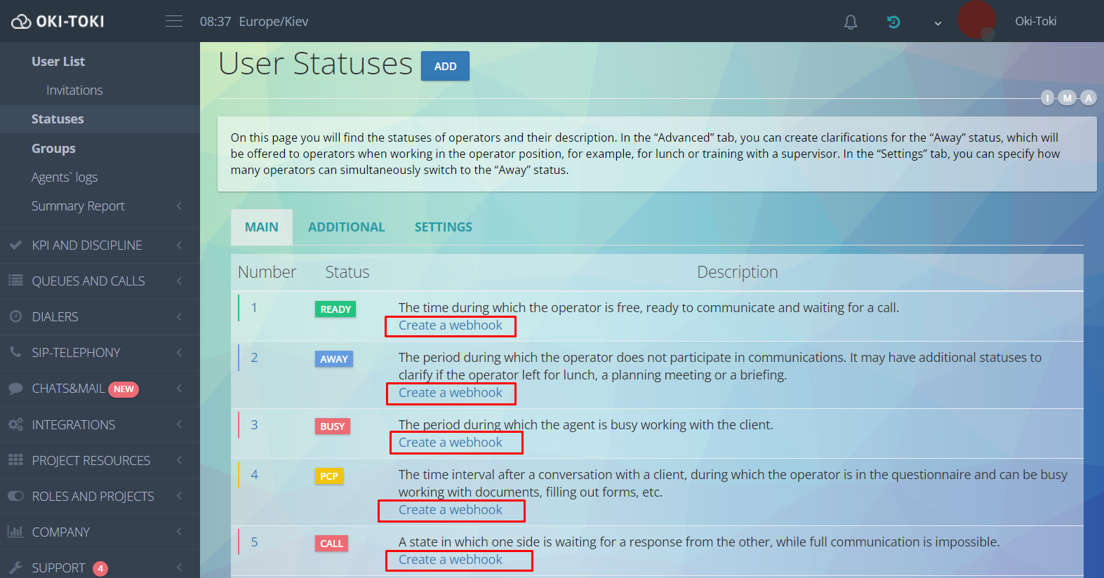 Ahora se pueden crear eventos en un par de clics. Esto está disponible en las configuraciones de Límites Disciplinarios, así como en las configuraciones de estados del agente. Un clic en el botón automáticamente insertará todos los parámetros necesarios para capturar el estado o infracción. Esto es solo el principio, continuaremos desarrollando esta dirección.