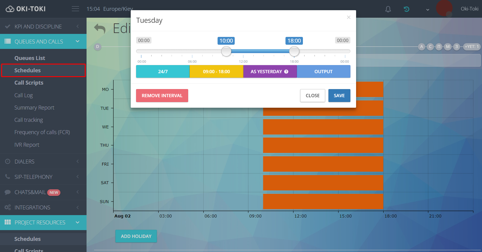 - Al hacer clic en el campo vacío aparecerá un control deslizante que se puede ajustar para establecer el horario de trabajo. Si el horario no cambia dependiendo del día de la semana – se puede utilizar el botón «Como ayer» y no será necesario ajustar los deslizadores cada vez. También se pueden añadir feriados al horario;