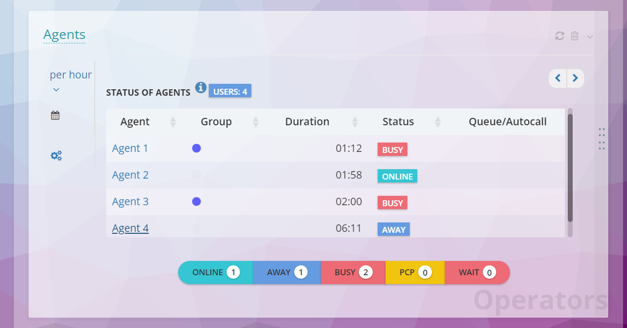 ¿Necesitas controlar los estados de los agentes? Hay una herramienta para eso en el puesto de trabajo, muestra el tiempo y quién está en qué estado. Con nuestro tablero y el widget «Agentes», puedes ver las estadísticas de los agentes en un modo de visualización amplio y cómodo. Para esto, no olvides cambiar a la vista de TV. El widget «Agentes» permite mostrar los estados de los agentes en tiempo real, así como filtrar los datos por estados específicos.