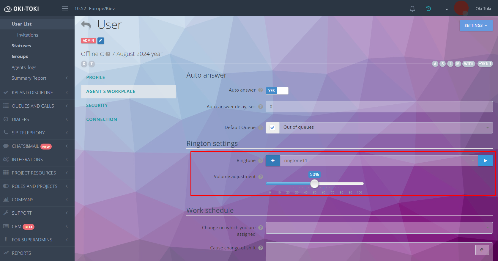 Se ha añadido la posibilidad de cargar tonos de llamada personalizados en el lugar de trabajo, que sonarán durante una llamada entrante. Los operadores pueden cargar tonos de llamada (ver captura de pantalla). Los roles de «Operador» y «Supervisor» pueden cargar hasta 5 tonos personalizados, mientras que los usuarios con el rol de «Administrador» o cualquier otro rol con este derecho tienen acceso adicional a hasta 5 tonos para todos los empleados de la empresa. Los tonos deben cargarse en formato .mp3/.wav con un tamaño máximo de 3 MB.