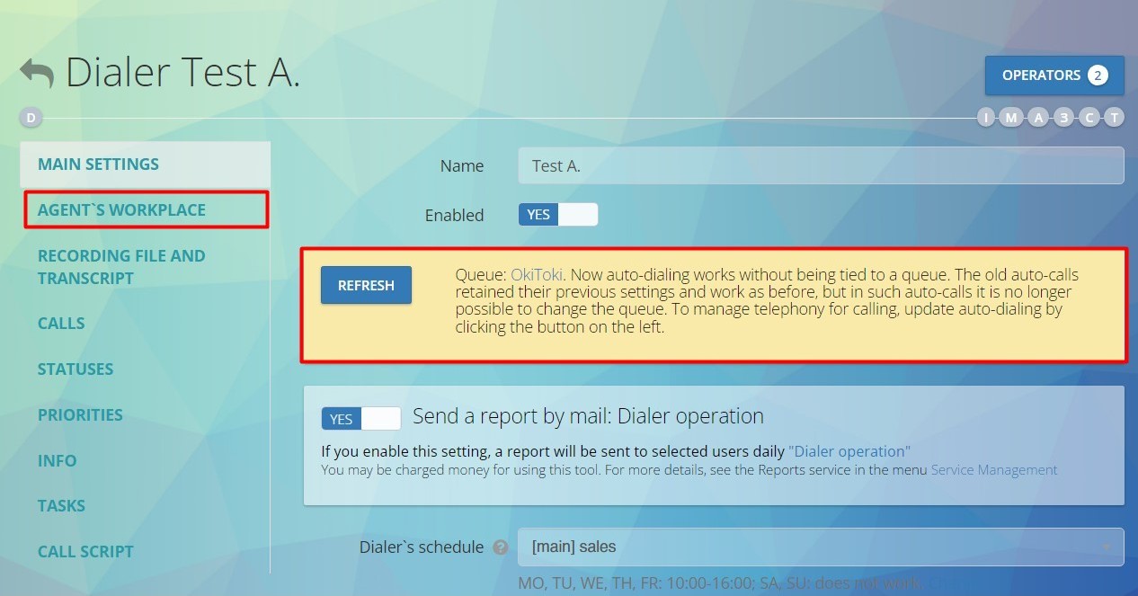 Hemos eliminado la conexión de las llamadas automáticas con la cola – ahora (¡por fin!) estos son dos instrumentos independientes. Las configuraciones importantes para los agentes se integraron por separado en las llamadas automáticas de la cola (pestaña “Lugar de trabajo del agente”). ¡La actualización fue especialmente del agrado de las empresas con mensajes de voz masivos! Vea más detalles en youtube.