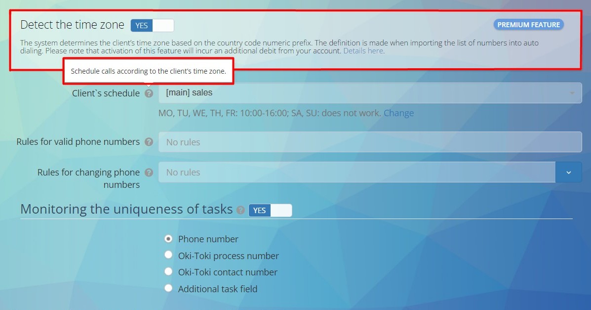La determinación de zonas horarias por el prefijo numérico del número de teléfono ahora funciona para todo el mundo. La zona horaria del abonado se determina al importarlo en llamadas automáticas o al hacer una llamada manual desde “el lugar de trabajo del agente”. Esta opción generalmente se usa en conjunto con el parámetro «Horario del cliente», que limita las llamadas al cliente fuera del horario laboral.