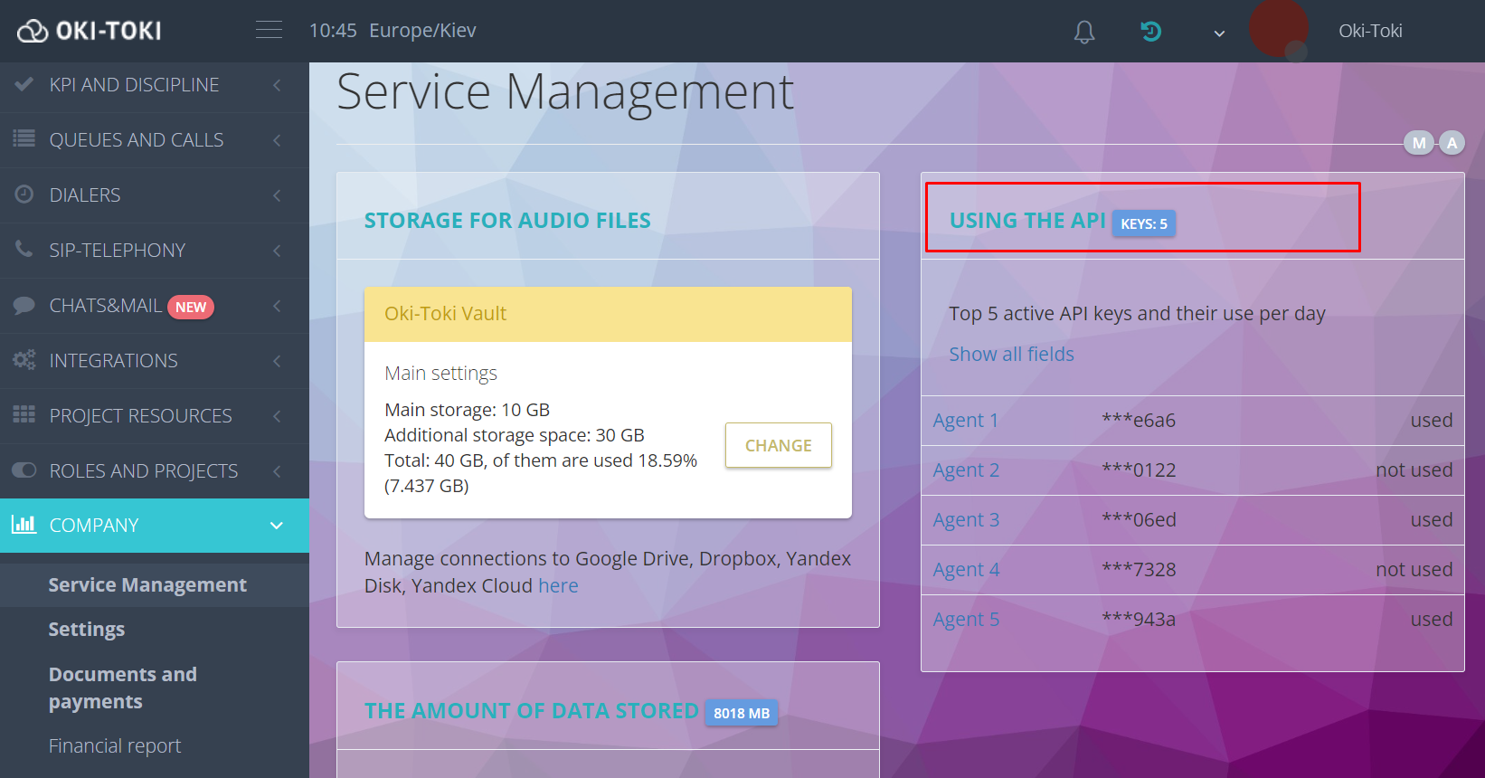 En la sección «Gestión de servicios» se ha añadido un widget que ayuda a controlar los gastos en llamadas API – el widget muestra todas las claves api activas en el sistema y cuenta la cantidad de llamadas API realizadas con estas claves.