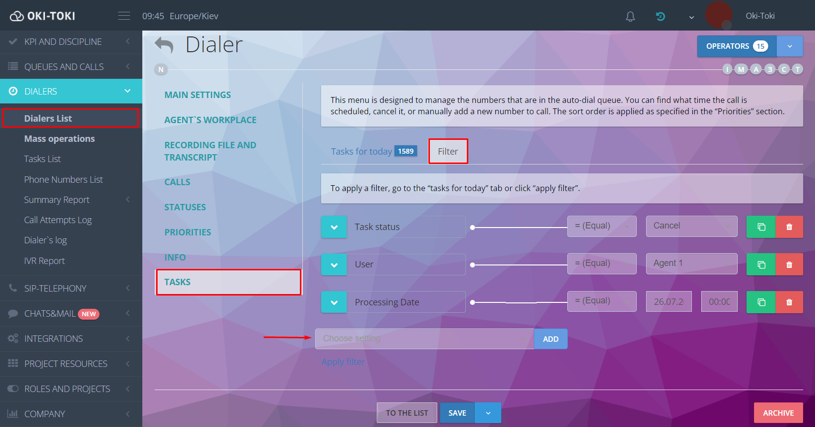 Se ha implementado una organización y filtración compleja de tareas en llamadas automáticas. Si antes las capacidades de filtración estaban limitadas a la selección del periodo de tiempo planificado para la siguiente llamada y el filtro por número de teléfono, ahora también puedes filtrar por el usuario responsable, por la zona horaria, por el número de importaciones, y otros.