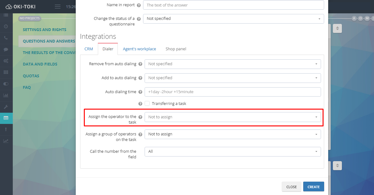 Entramos en las configuraciones de respuesta del script de diálogo que nos interesa, ya con la adición a llamadas automáticas activada (funciona en modo Callback). En las configuraciones se puede especificar la opción «Usuario» (usuario actual) o elegir un usuario específico, al que se fijarán los contactos en el callback.