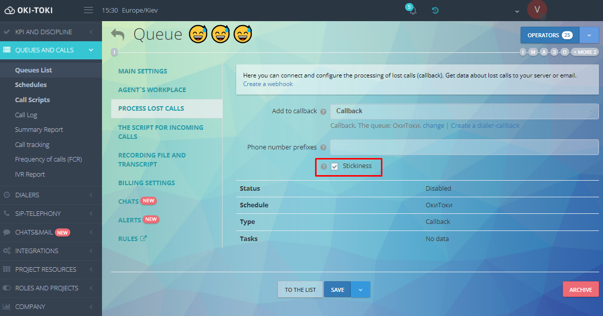 Este artículo se refiere al producto Llamadas automáticasLe hemos llamado «Callback pegajoso». Se puede utilizar tanto al añadir una tarea en callback desde un formulario en el CRM como al procesar las llamadas entrantes perdidas. Se puede fijar el contacto a un usuario específico, o al usuario actual que está procesando la ficha del cliente en el CRM. El procesamiento de llamadas perdidas fija el callback al último agente que tuvo una conversación con ese cliente. Por cierto, en el 2022 añadimos la adherencia de grupo actualizada, sobre ella se puede leer más aquí.