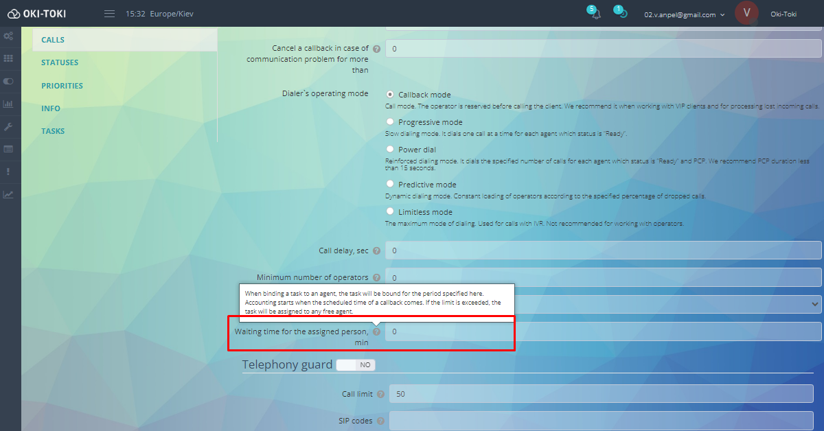 Indique el modo de llamada «Callback mode» y la duración de espera del responsable. Al llegar el tiempo en que la tarea está programada para el callback, comenzará la cuenta regresiva de espera. Cuando el tiempo de espera del responsable termine, la tarea se libera del responsable y pasa al primer agente libre.