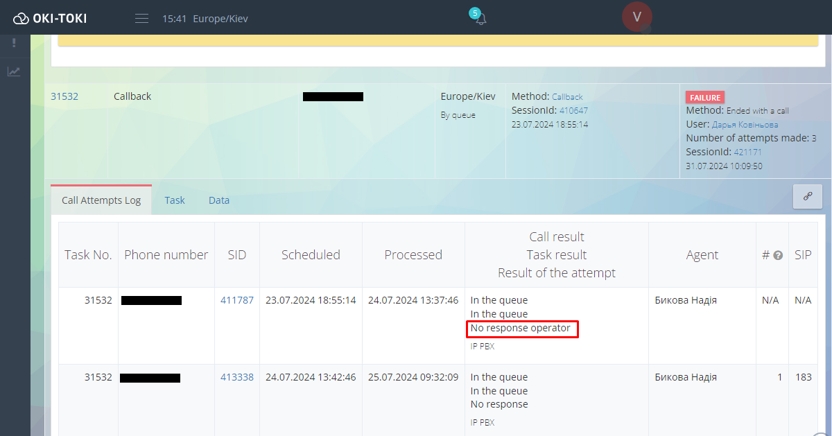 En el registro de intentos de llamadas automáticas se registra cuando el tiempo de espera del responsable finaliza;